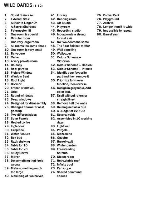 You would typically receive a set of randomly generated prompts which together generate a more or less paradoxical brief. You might get Proportional, Basalt, Thatch, Within Five Minutes of Your House, French Windows, Make Something Much Too Large.