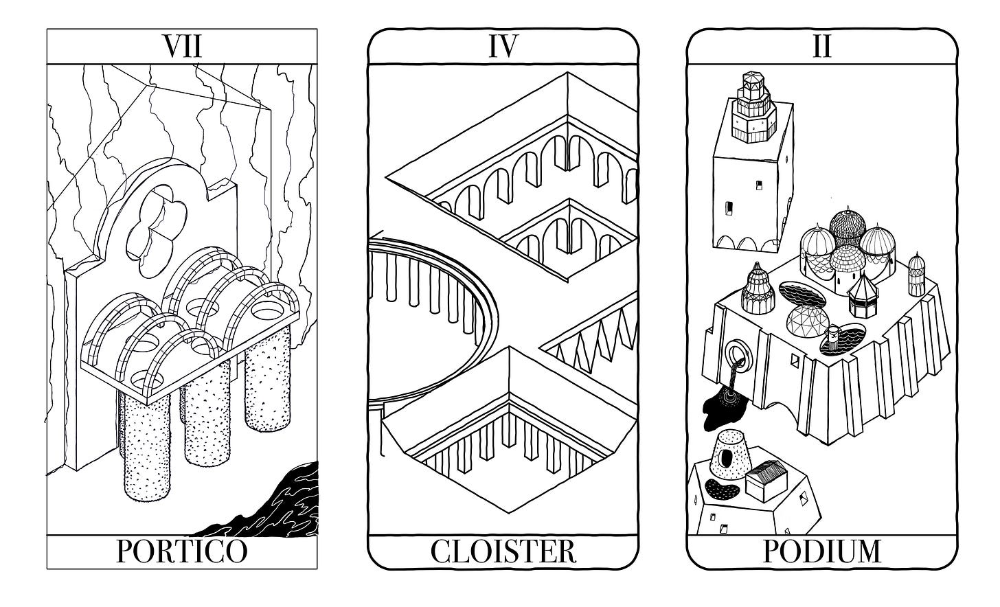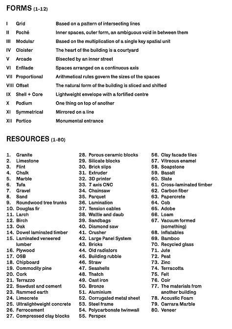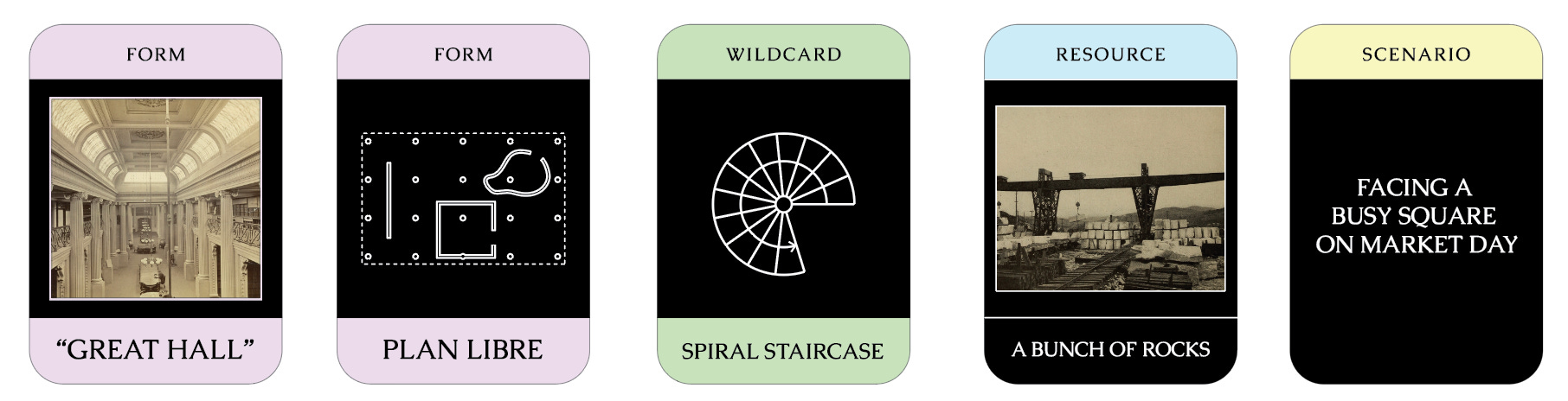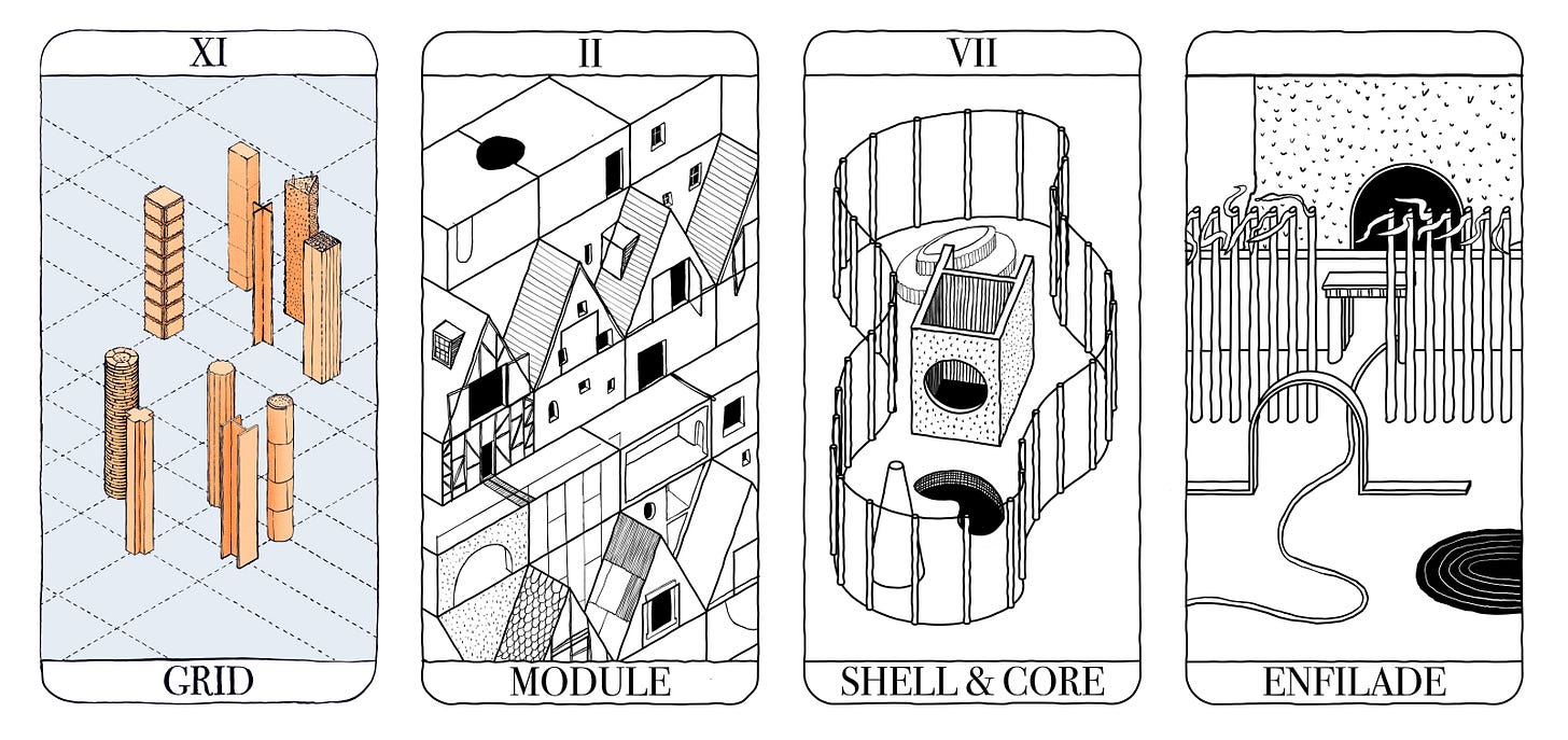 I developed this game a few years ago in collaboration with a couple of friends as a tool for architecture students. It is a tool for learning how to work fast, produce ideas, think in a propositional way, through different materials, design methods and styles. At one point I felt inspired to try to develop it further, and began drawing a kind of quasi-tarot presentation of some of the ‘cards’ but I ran out of energy, and I’m publishing it in more of less the state we left it, in the hope that someone might find it interesting.