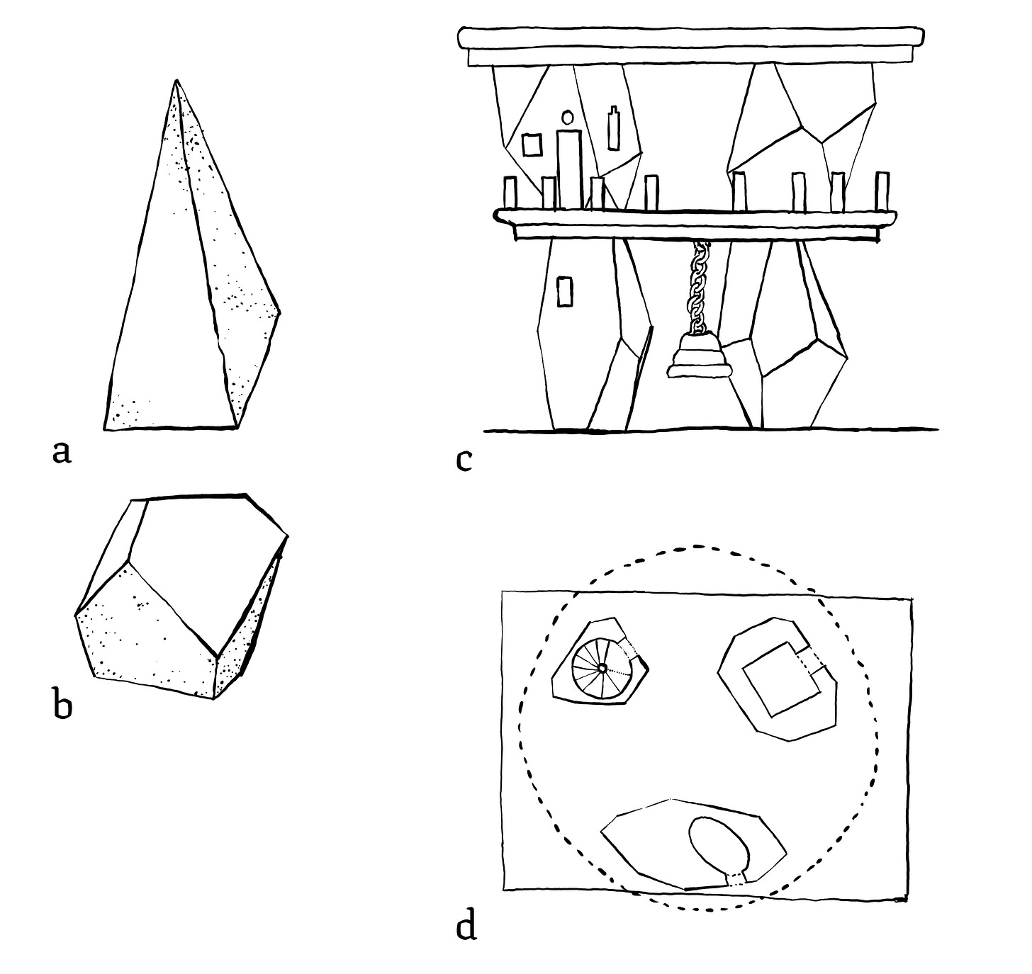 In the end, I draw an arrangement of melancholia blocks as a kind of wedding cake with a big bell (c,d)